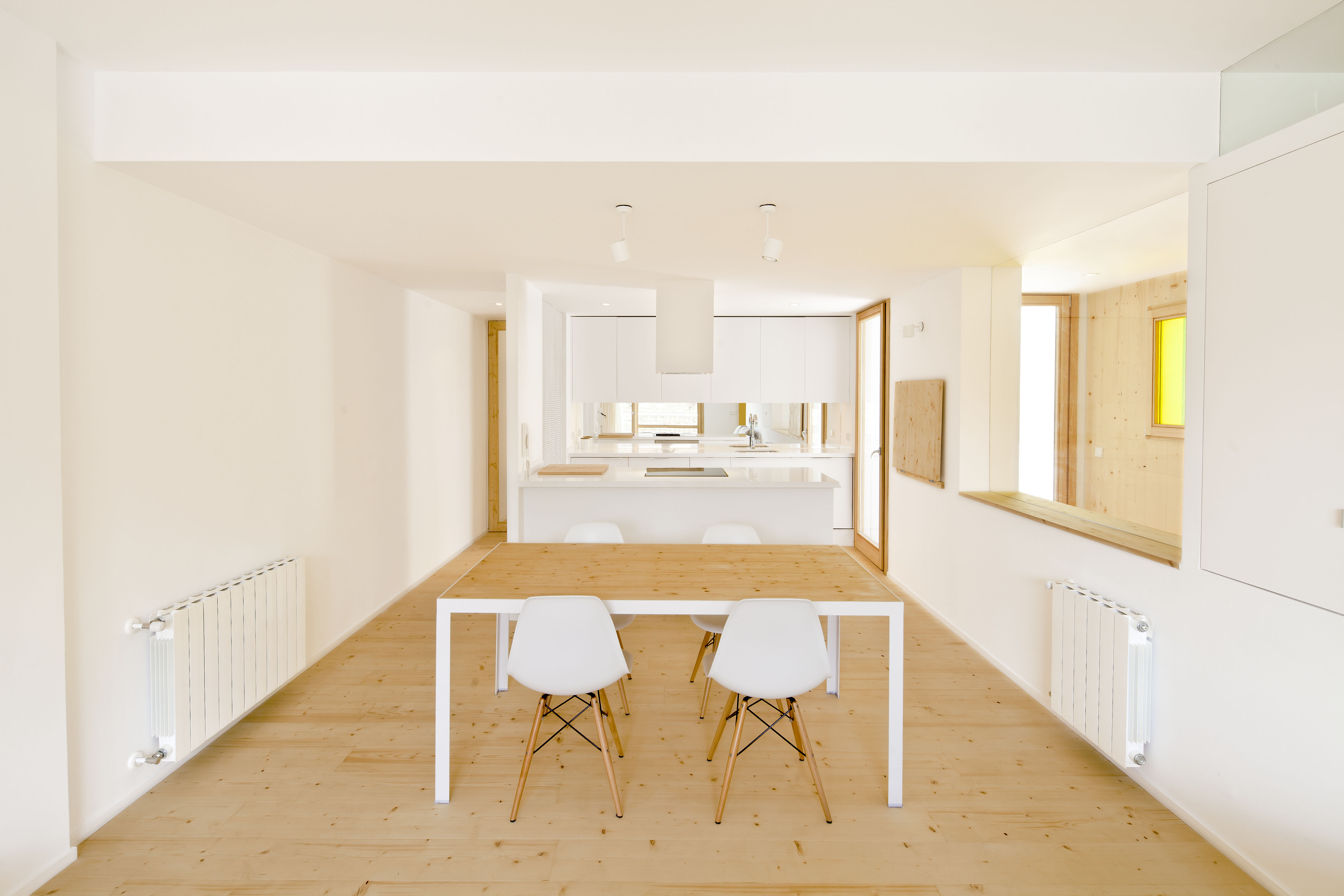 Se utilizó pino en el suelo y en algunos paramentos, y blanco en paredes, armarios, cocina y elementos de mobiliario. El resultado fue una estética minimalista con gran personalidad.